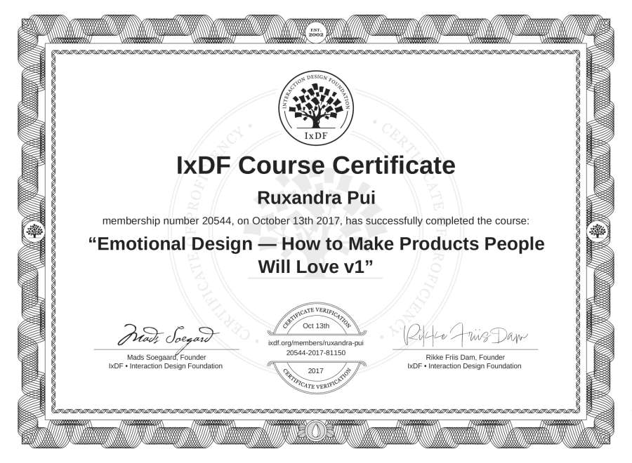 Ruxandra Pui's IxDF Course Certificate: Emotional Design — How to Make Products People Will Love v1