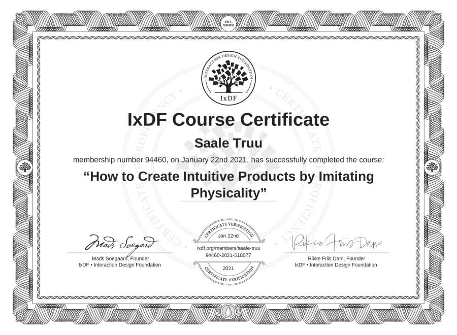 Saale Truu's IxDF Course Certificate: How to Create Intuitive Products by Imitating Physicality