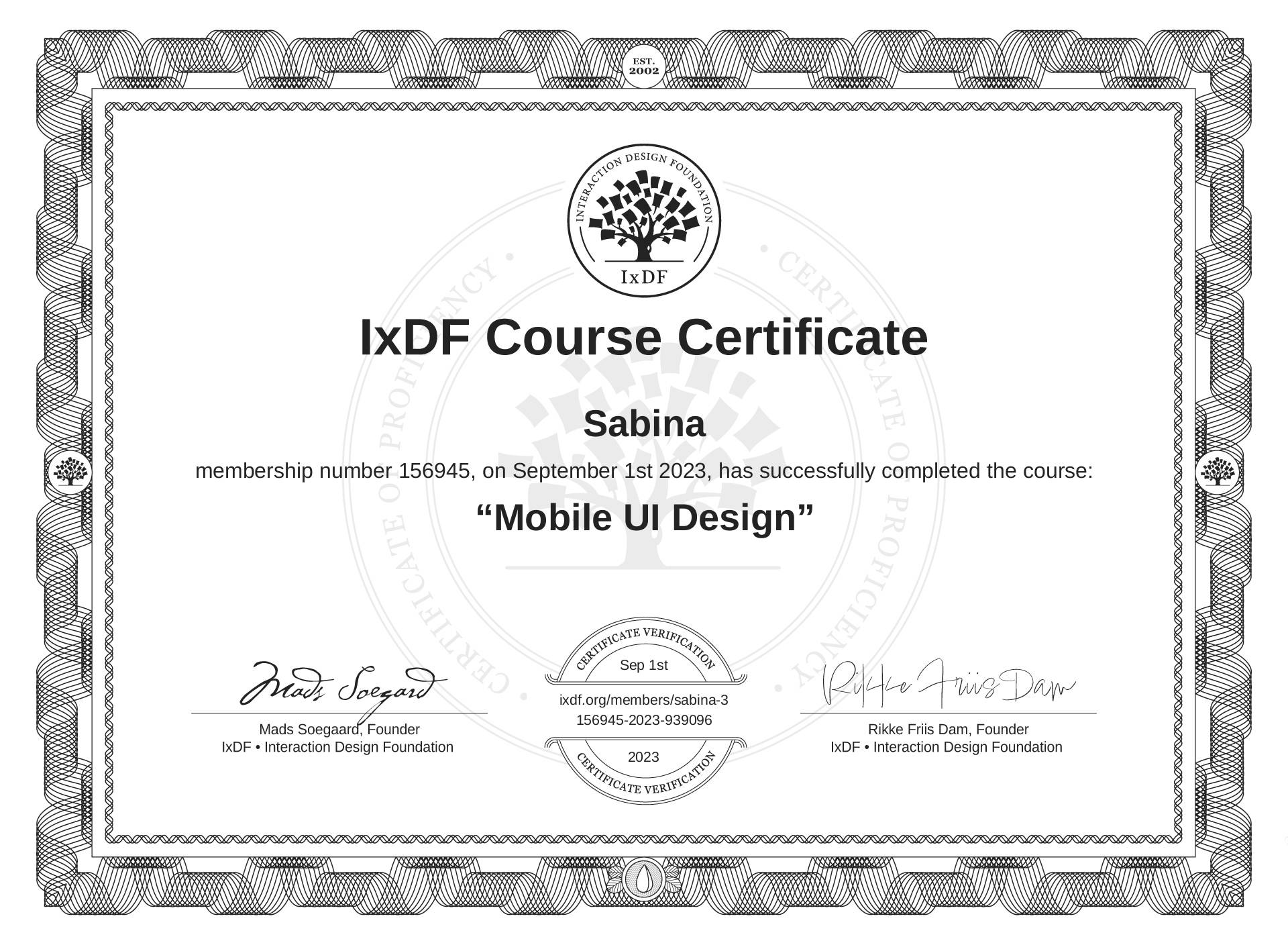The IxDF Course Certificate above is awarded to Sabina in formal recognition of their coursework surpassing the rigorous benchmarks of exceptional performance established by the IxDF Educational Codex.