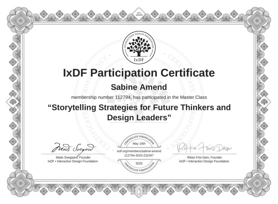 Sabine Amend's IxDF Masterclass Certificate: Storytelling Strategies for Future Thinkers and Design Leaders