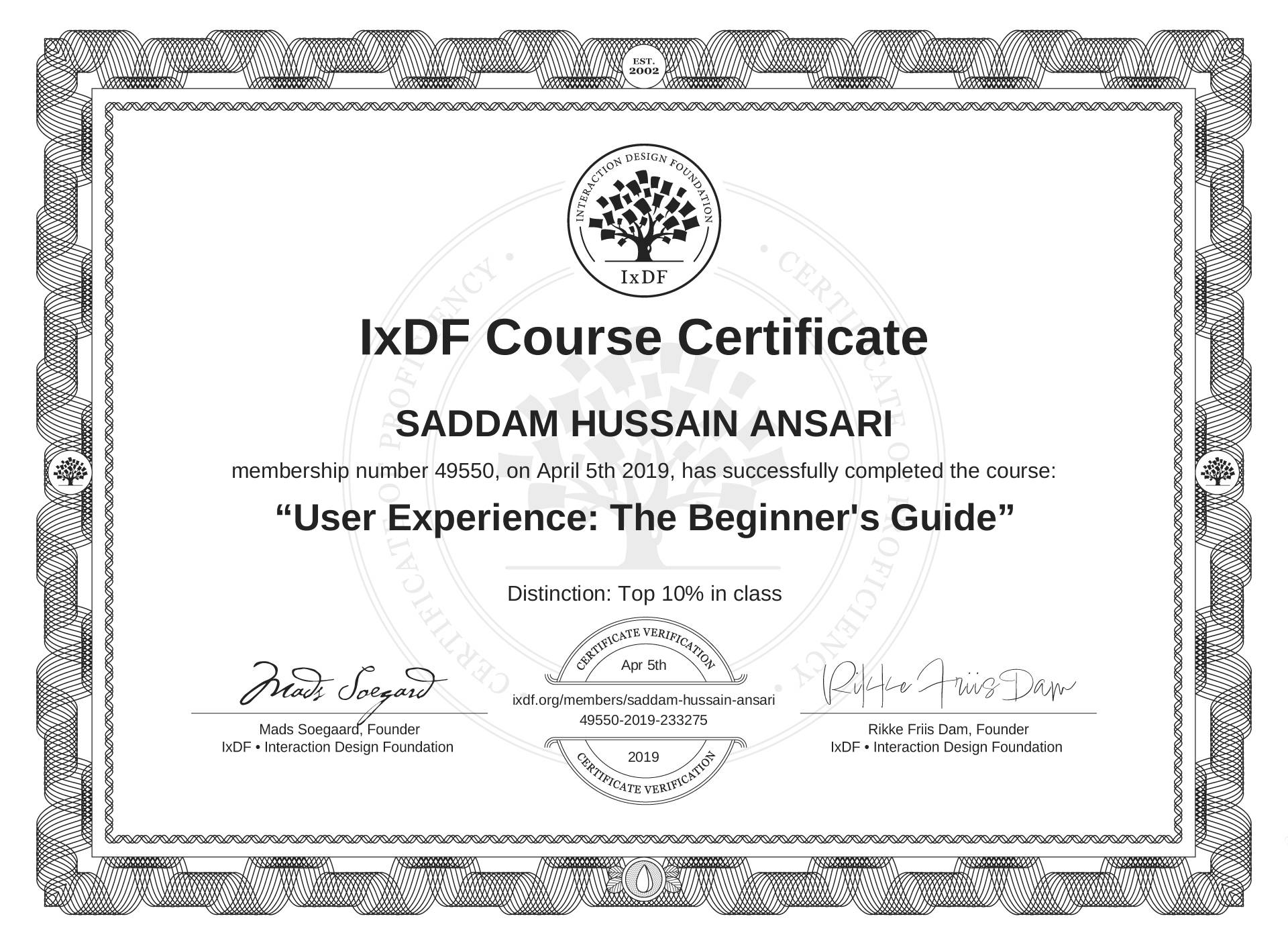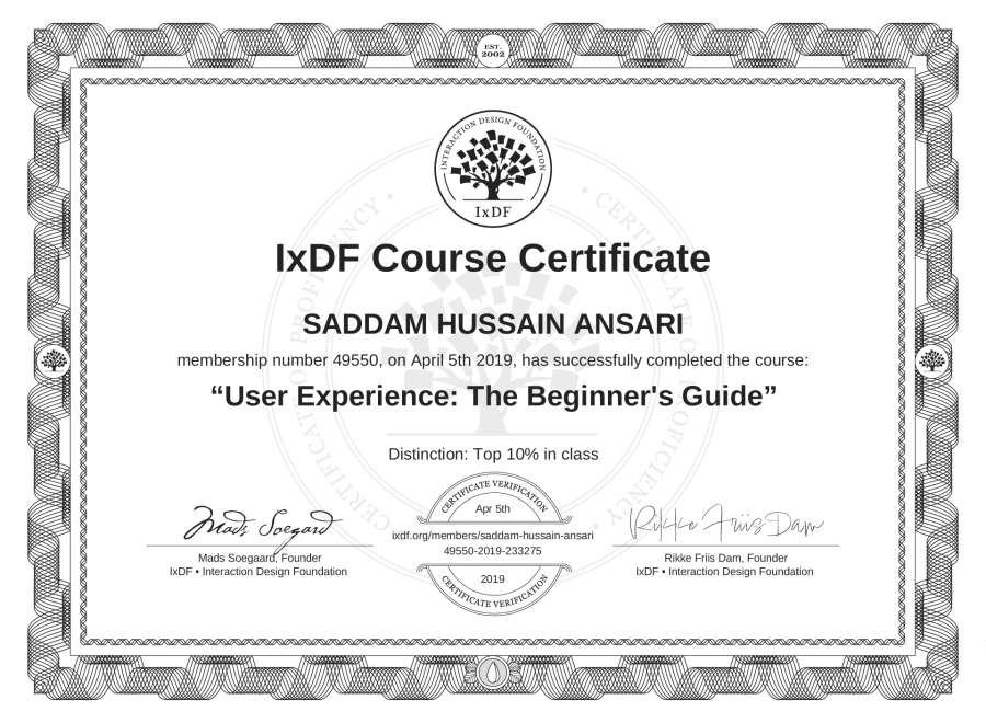 SADDAM HUSSAIN ANSARI's IxDF Course Certificate: User Experience: The Beginner's Guide