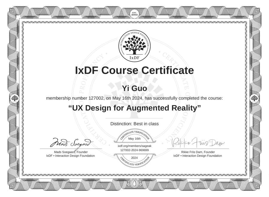 The IxDF Course Certificate above is awarded to Yi Guo with a Best in Class Distinction in formal recognition of their coursework surpassing the rigorous benchmarks of exceptional performance established by the IxDF Educational Codex.