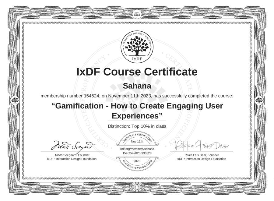 Sahana's IxDF Course Certificate: Gamification - How to Create Engaging User Experiences
