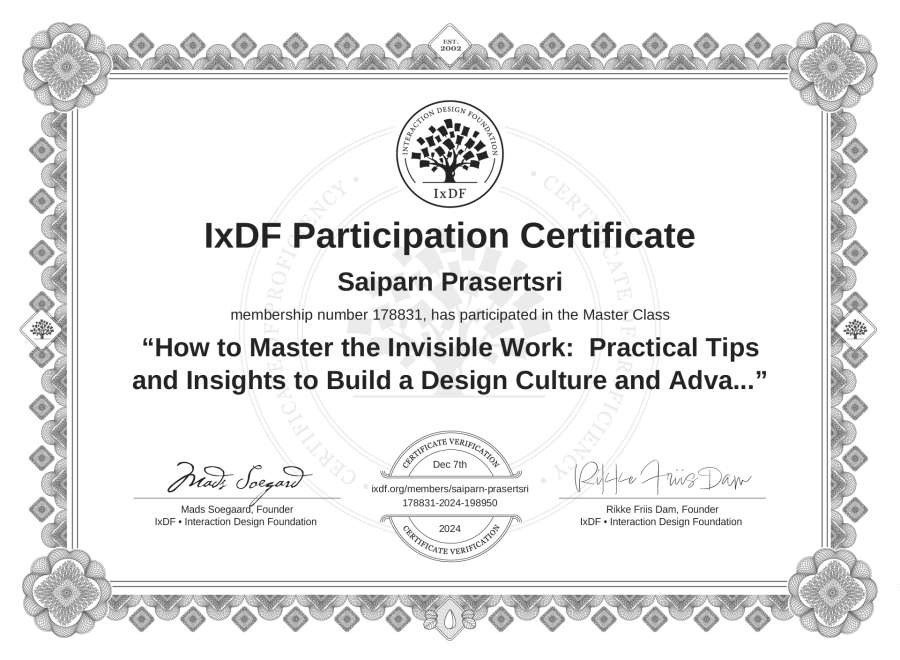 Saiparn Prasertsri's IxDF Masterclass Certificate: How to Master the Invisible Work: Practical Tips and Insights to Build a Design Culture and Advance Your Career