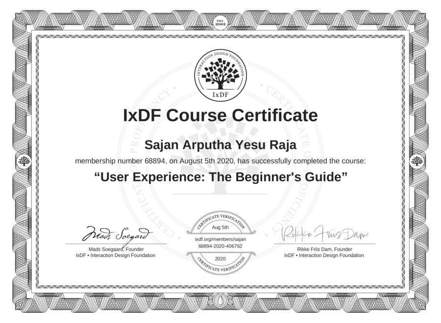 The IxDF Course Certificate above is awarded to Sajan Arputha Yesu Raja in formal recognition of their coursework surpassing the rigorous benchmarks of exceptional performance established by the IxDF Educational Codex.