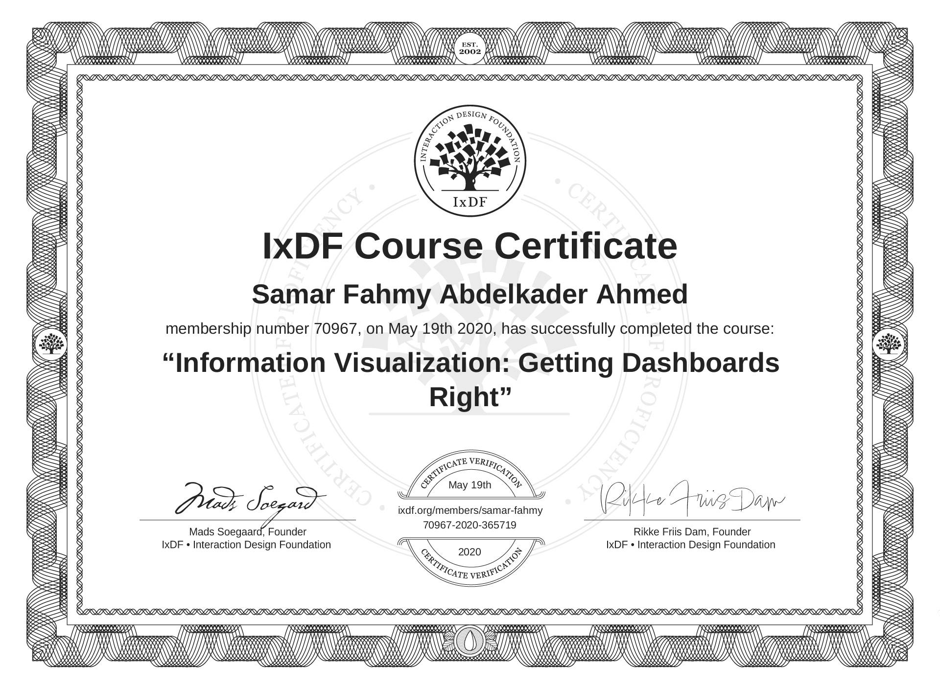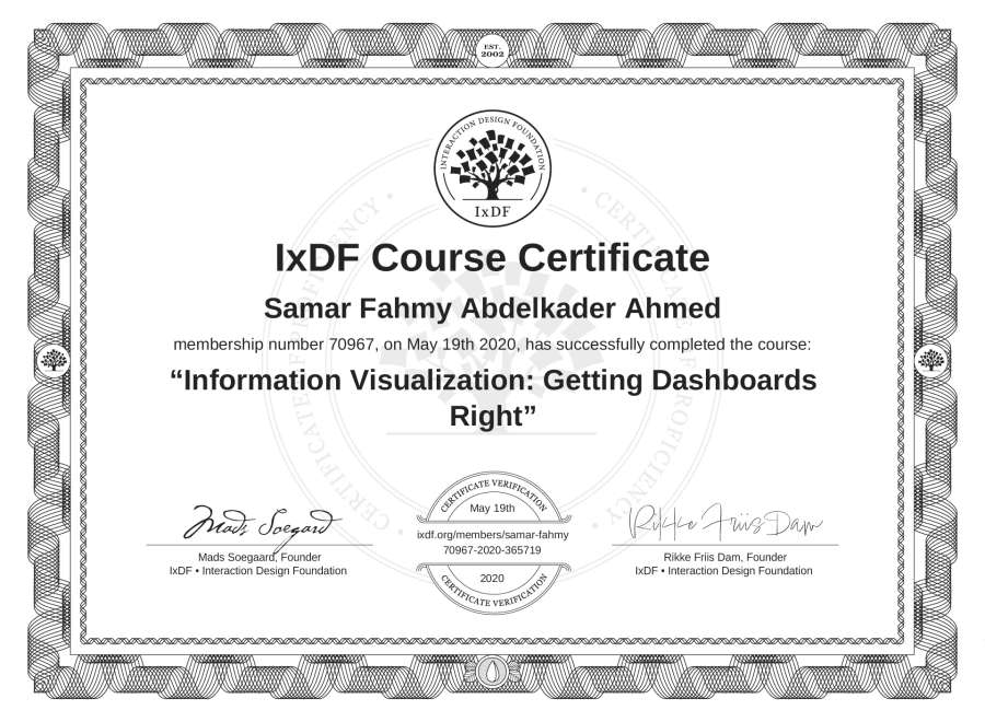 Samar Fahmy Abdelkader Ahmed's IxDF Course Certificate: Information Visualization: Getting Dashboards Right