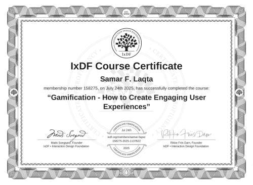 IxDF Course Certificates are awarded to Samar F. Laqta in formal recognition of their coursework surpassing the rigorous benchmarks of exceptional performance established by the IxDF Educational Codex.