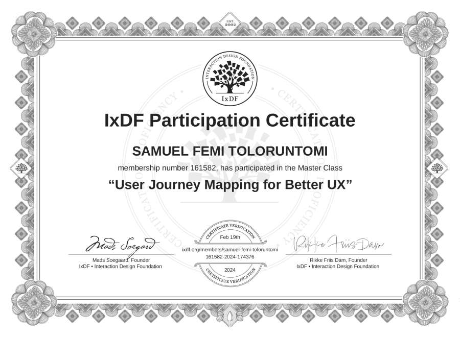 Samuel Toloruntomi's IxDF Masterclass Certificate: User Journey Mapping for Better UX