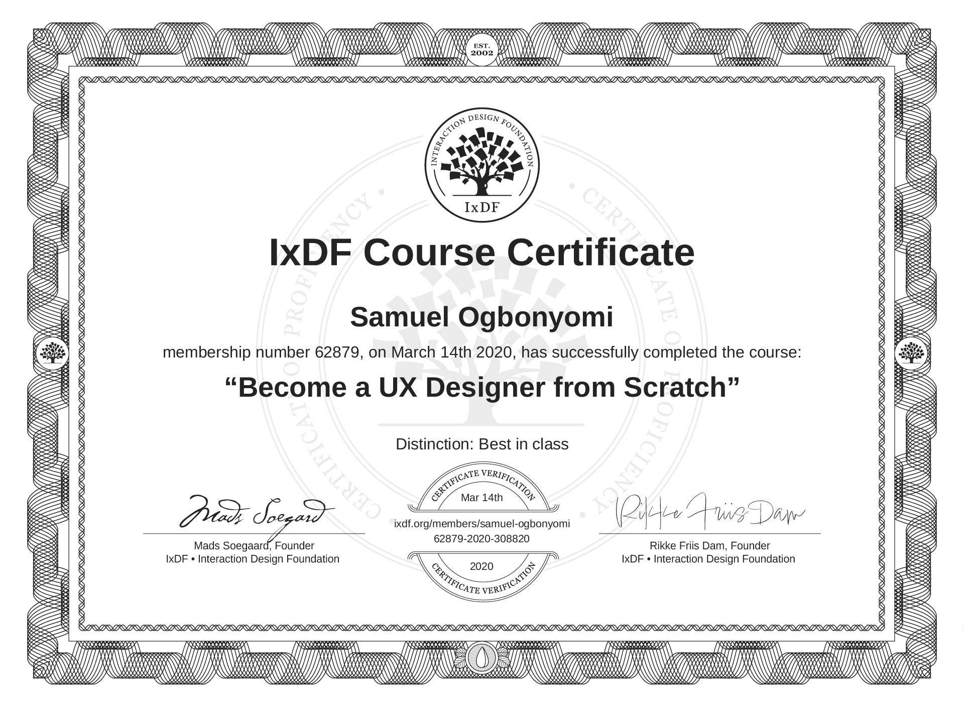Samuel Ogbonyomi's IxDF Course Certificate: Become a UX Designer from Scratch