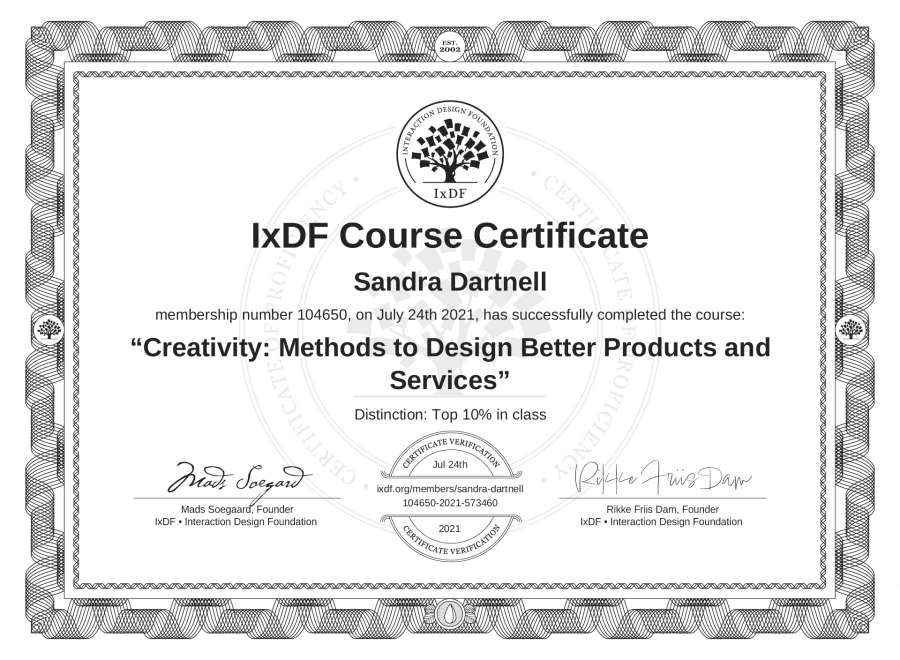 Sandra Dartnell's IxDF Course Certificate: Creativity: Methods to Design Better Products and Services