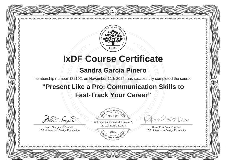 Sandra Garcia Piñero's IxDF Course Certificate: Present Like a Pro: Communication Skills to Fast-Track Your Career
