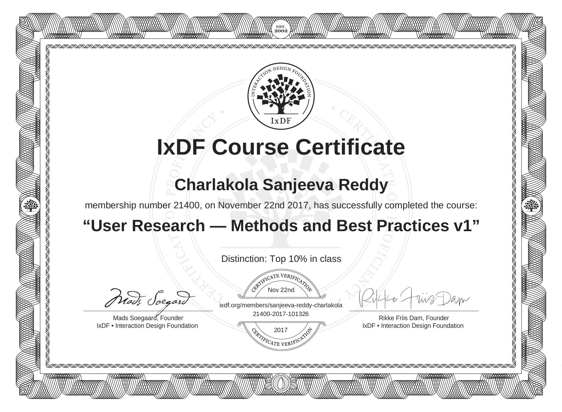 Charlakola Sanjeeva Reddy's IxDF Course Certificate: User Research — Methods and Best Practices v1