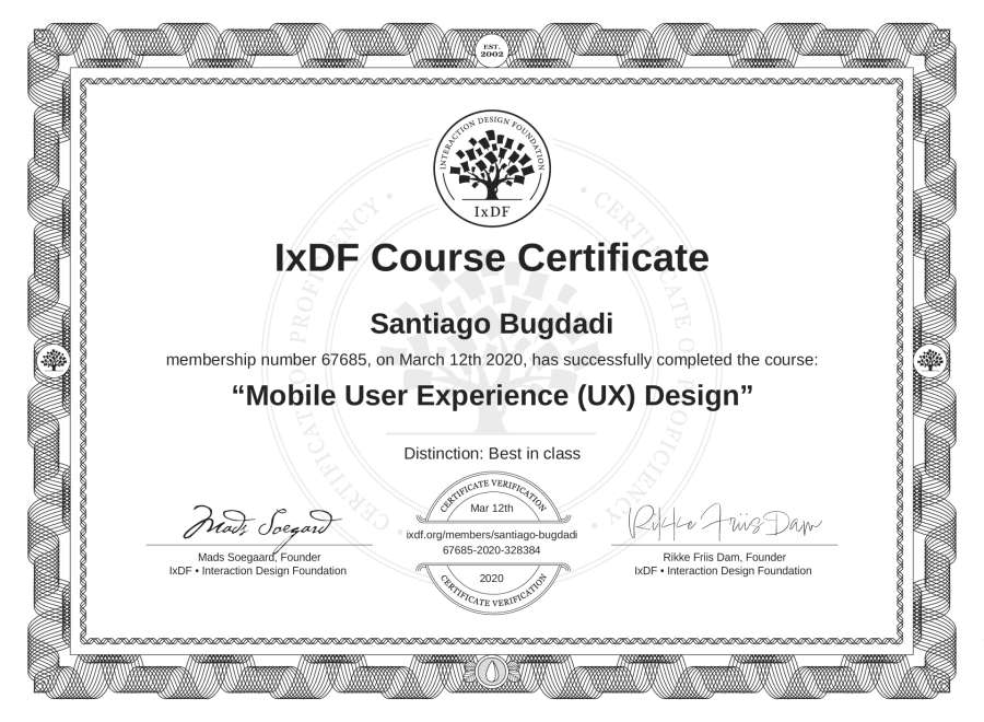 The IxDF Course Certificate above is awarded to Santiago Bugdadi with a Best in Class Distinction in formal recognition of their coursework surpassing the rigorous benchmarks of exceptional performance established by the IxDF Educational Codex.
