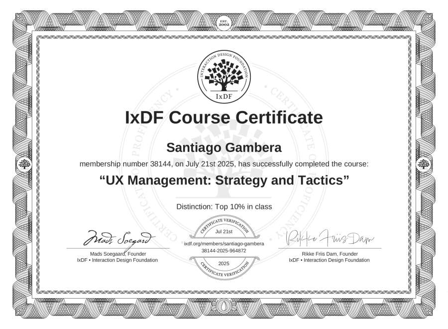 Santiago Gambera's IxDF Course Certificate: UX Management: Strategy and Tactics