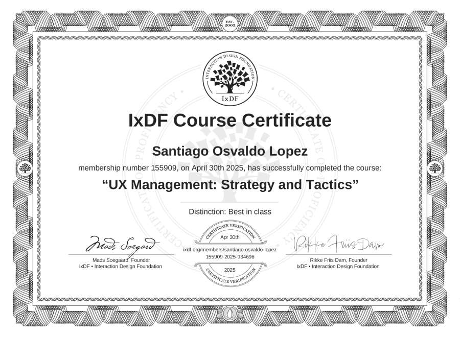 The IxDF Course Certificate above is awarded to Santiago Osvaldo López with a Best in Class Distinction in formal recognition of their coursework surpassing the rigorous benchmarks of exceptional performance established by the IxDF Educational Codex.
