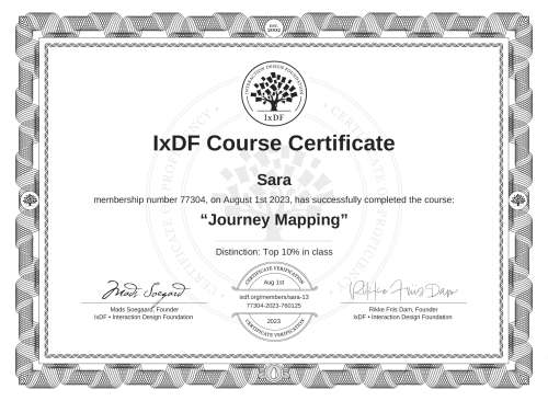 IxDF Course Certificates are awarded to Sara in formal recognition of their coursework surpassing the rigorous benchmarks of exceptional performance established by the IxDF Educational Codex.