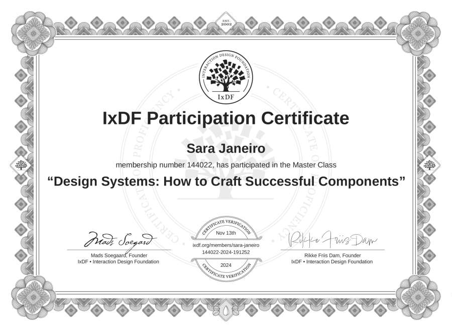 Sara Janeiro's IxDF Masterclass Certificate: Design Systems: How to Craft Successful Components