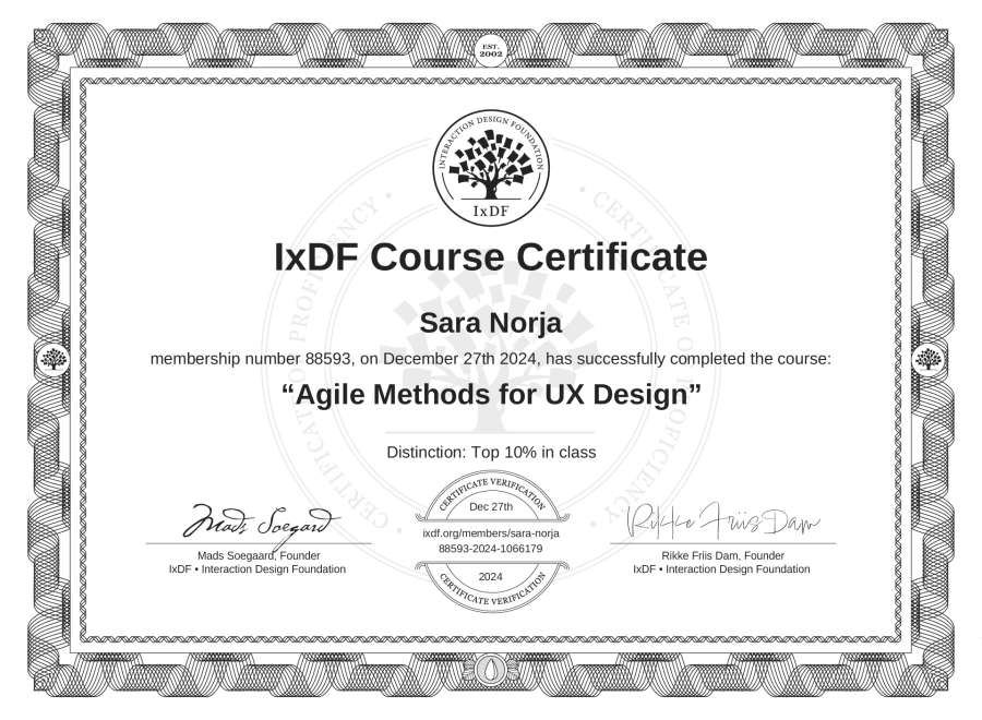 The IxDF Course Certificate above is awarded to Sara Norja with a Top 10% Distinction in formal recognition of their coursework surpassing the rigorous benchmarks of exceptional performance established by the IxDF Educational Codex.
