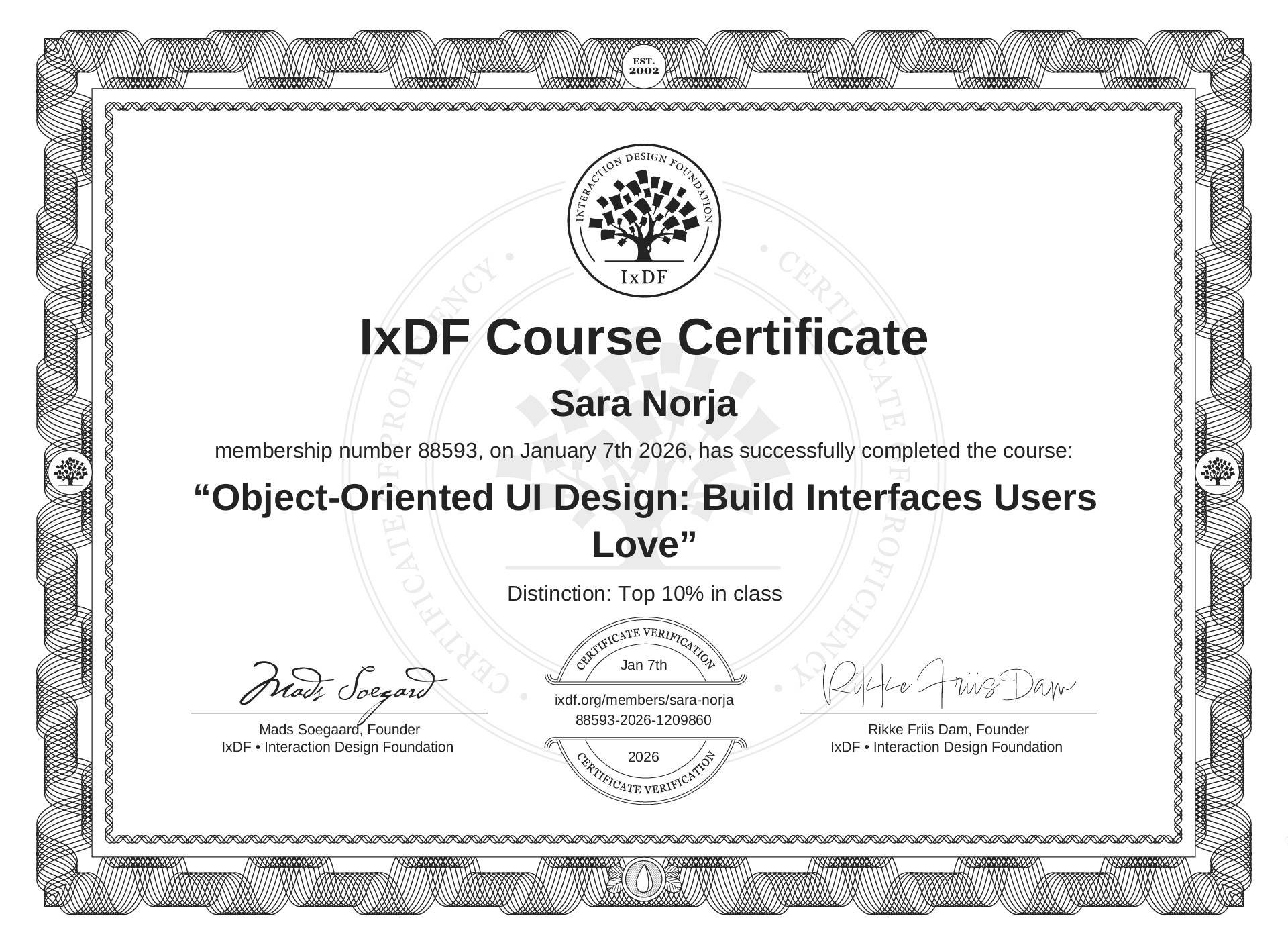 The IxDF Course Certificate above is awarded to Sara Norja with a Top 10% Distinction in formal recognition of their coursework surpassing the rigorous benchmarks of exceptional performance established by the IxDF Educational Codex.