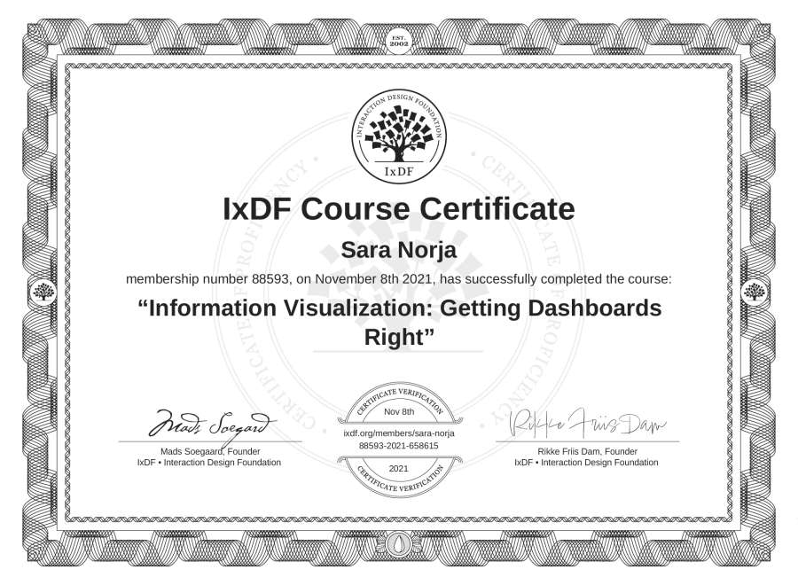 Sara Norja's IxDF Course Certificate: Information Visualization: Getting Dashboards Right