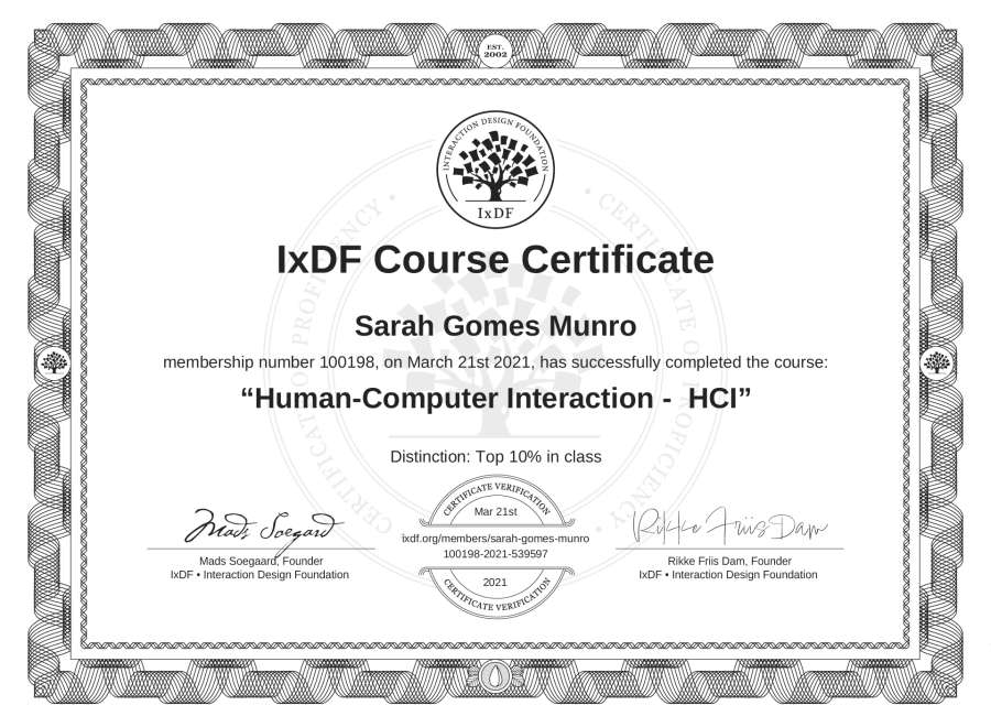 Sarah Gomes Munro's IxDF Course Certificate: Human-Computer Interaction - HCI