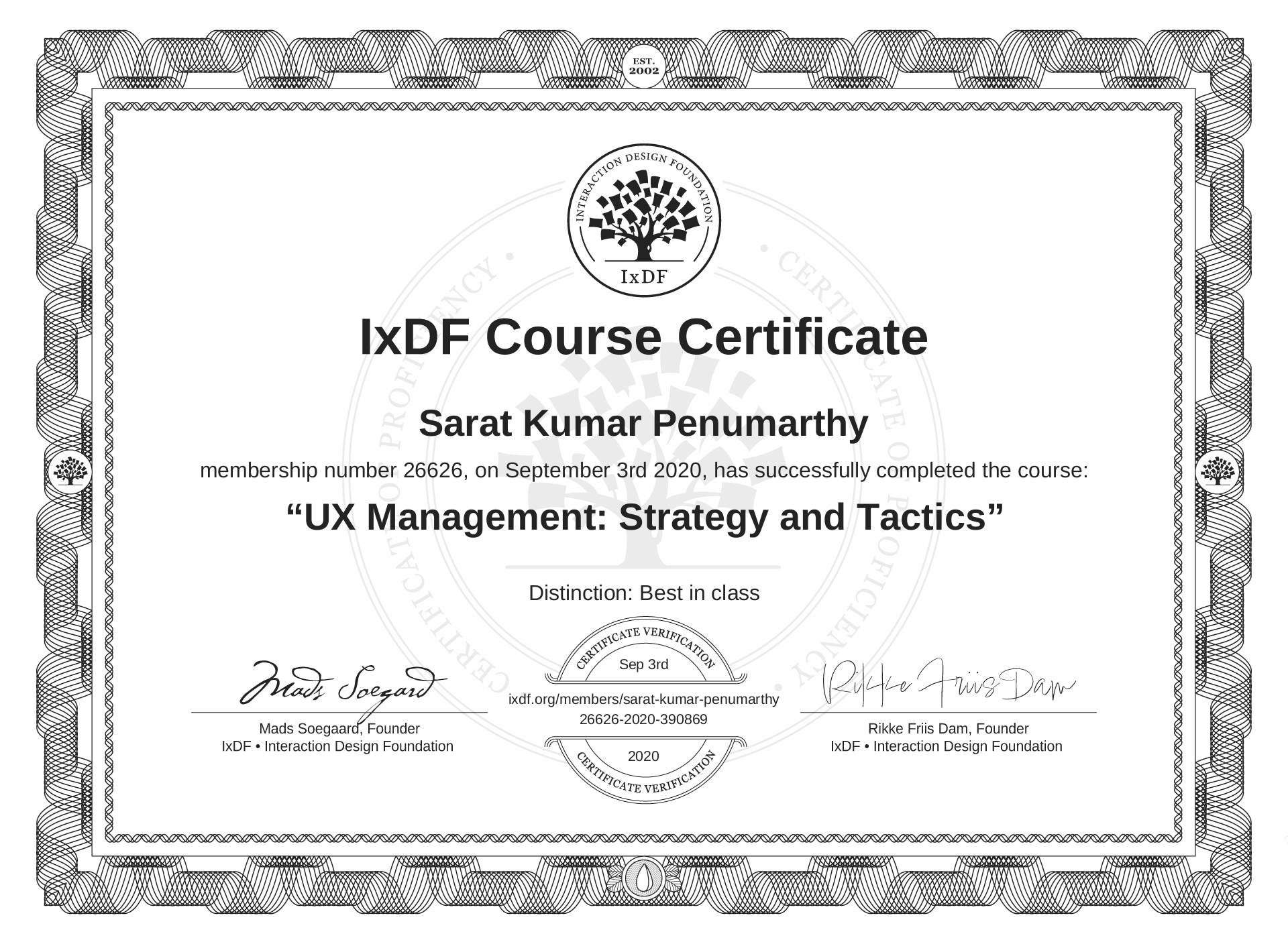 Sarat Kumar Penumarthy's IxDF Course Certificate: UX Management: Strategy and Tactics