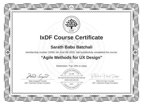 IxDF Course Certificates are awarded to Sarath Babu Batchali in formal recognition of their coursework surpassing the rigorous benchmarks of exceptional performance established by the IxDF Educational Codex.