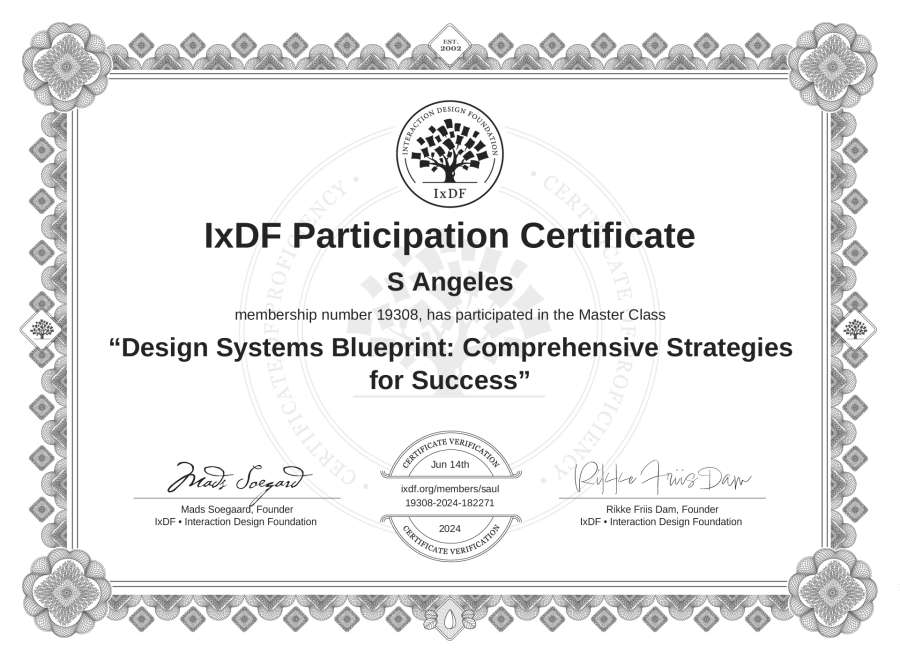 S Angeles's IxDF Masterclass Certificate: Design Systems Blueprint: Comprehensive Strategies for Success