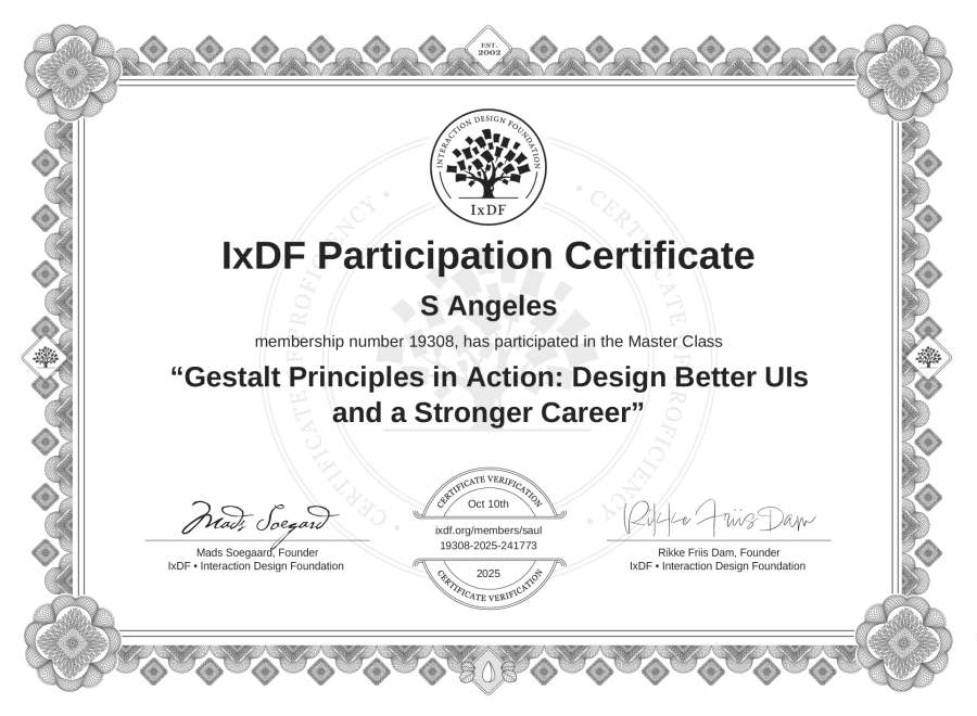 S Angeles's IxDF Masterclass Certificate: Gestalt Principles in Action: Design Better UIs and a Stronger Career