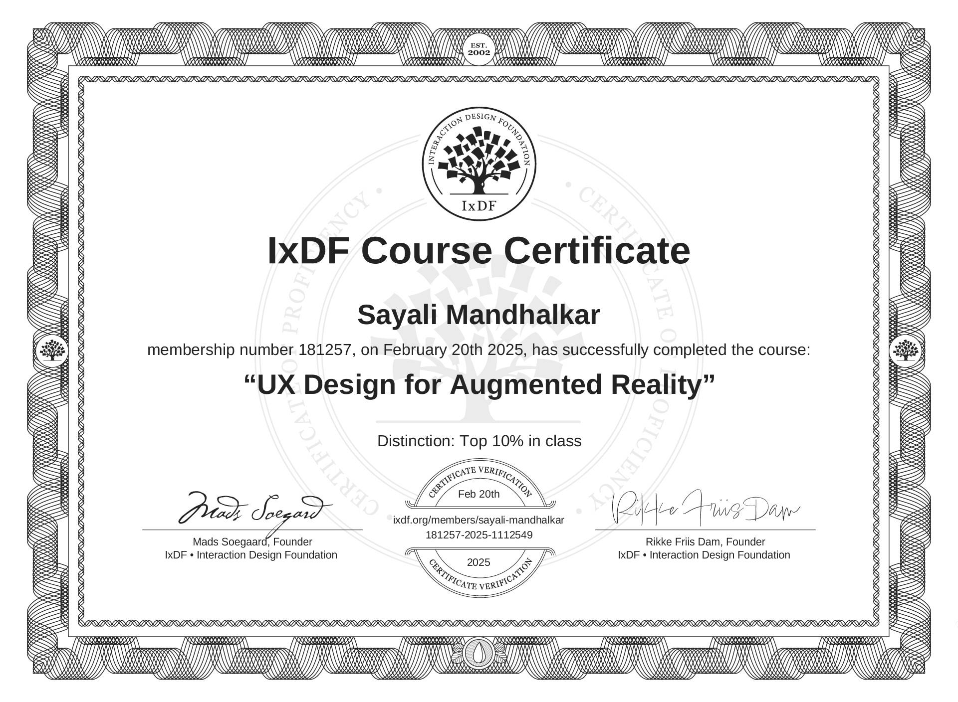 The IxDF Course Certificate above is awarded to Sayali Mandhalkar with a Top 10% Distinction in formal recognition of their coursework surpassing the rigorous benchmarks of exceptional performance established by the IxDF Educational Codex.