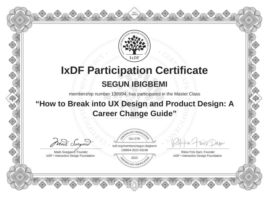 SEGUN IBIGBEMI's IxDF Masterclass Certificate: How to Break into UX Design and Product Design: A Career Change Guide