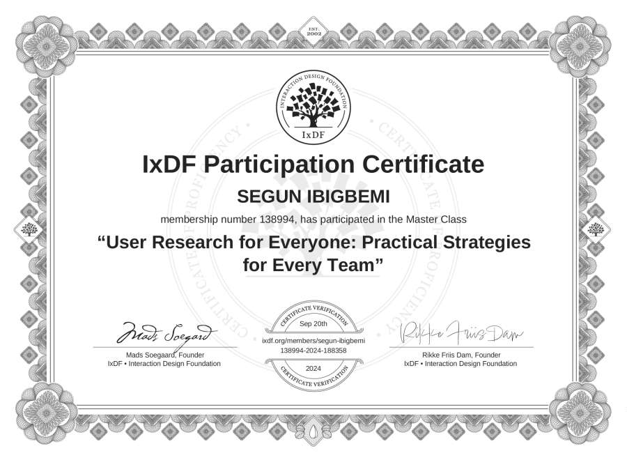 SEGUN IBIGBEMI's IxDF Masterclass Certificate: User Research for Everyone: Practical Strategies for Every Team