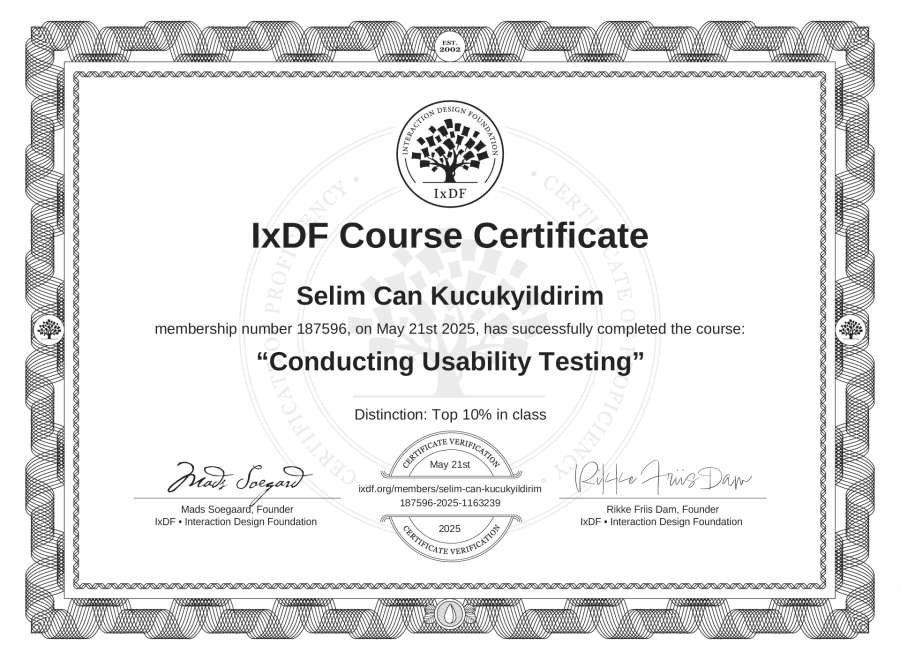 Selim Can Küçükyıldırım's IxDF Course Certificate: Conducting Usability Testing
