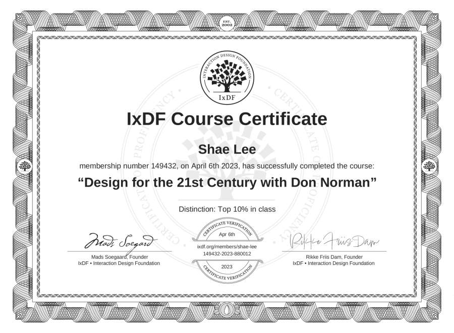 The IxDF Course Certificate above is awarded to Shae Lee with a Top 10% Distinction in formal recognition of their coursework surpassing the rigorous benchmarks of exceptional performance established by the IxDF Educational Codex.