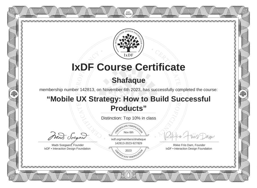Shafaque's IxDF Course Certificate: Mobile UX Strategy: How to Build Successful Products