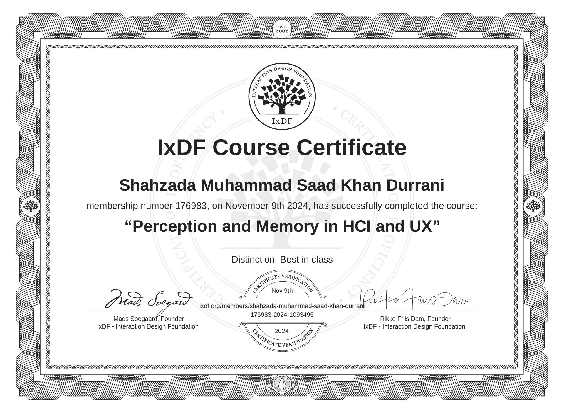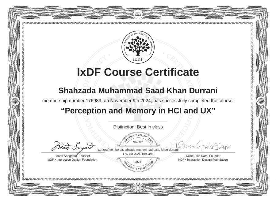 Shahzada Muhammad Saad Khan Durrani's IxDF Course Certificate: Perception and Memory in HCI and UX