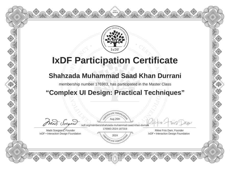Shahzada Muhammad Saad Khan Durrani's IxDF Masterclass Certificate: Complex UI Design: Practical Techniques