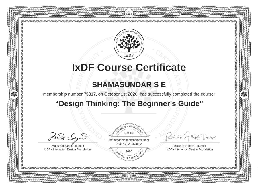 SHAMASUNDAR S E's IxDF Course Certificate: Design Thinking: The Beginner's Guide