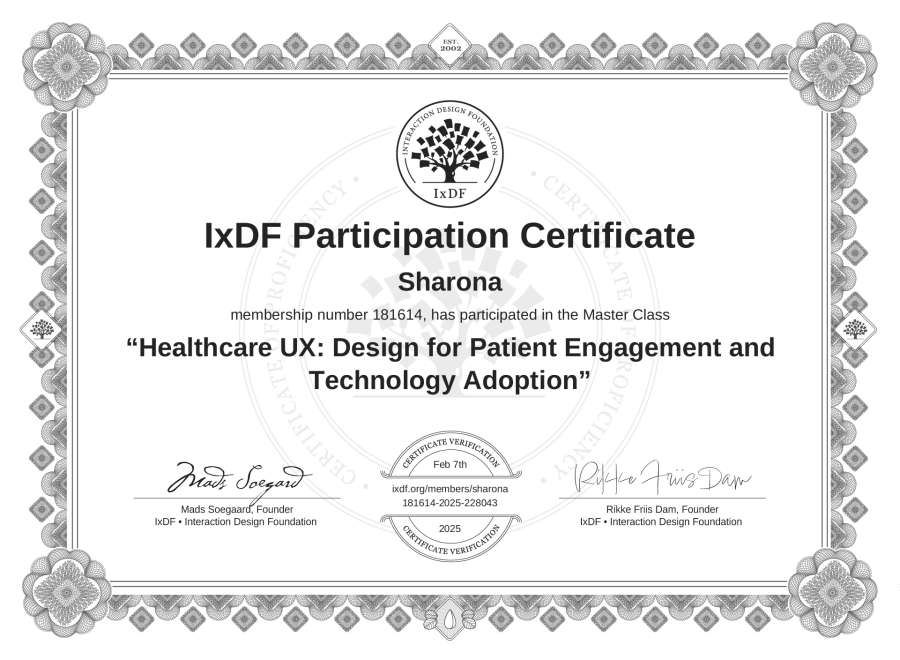 Sharona's IxDF Masterclass Certificate: Healthcare UX: Design for Patient Engagement and Technology Adoption
