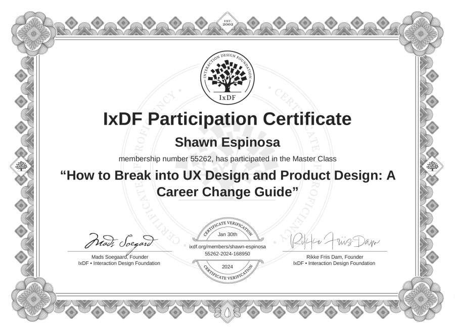 Shawn Espinosa's IxDF Masterclass Certificate: How to Break into UX Design and Product Design: A Career Change Guide