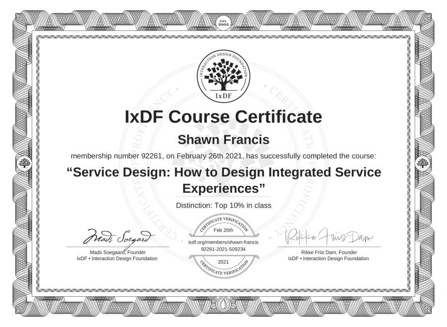Shawn Francis's IxDF Course Certificate: Service Design: How to Design Integrated Service Experiences