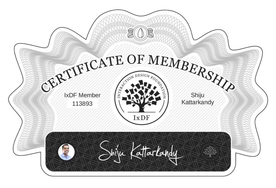 The Membership Certificate below verifies that Shiju Kattarkandy is a member of Interaction Design Foundation.