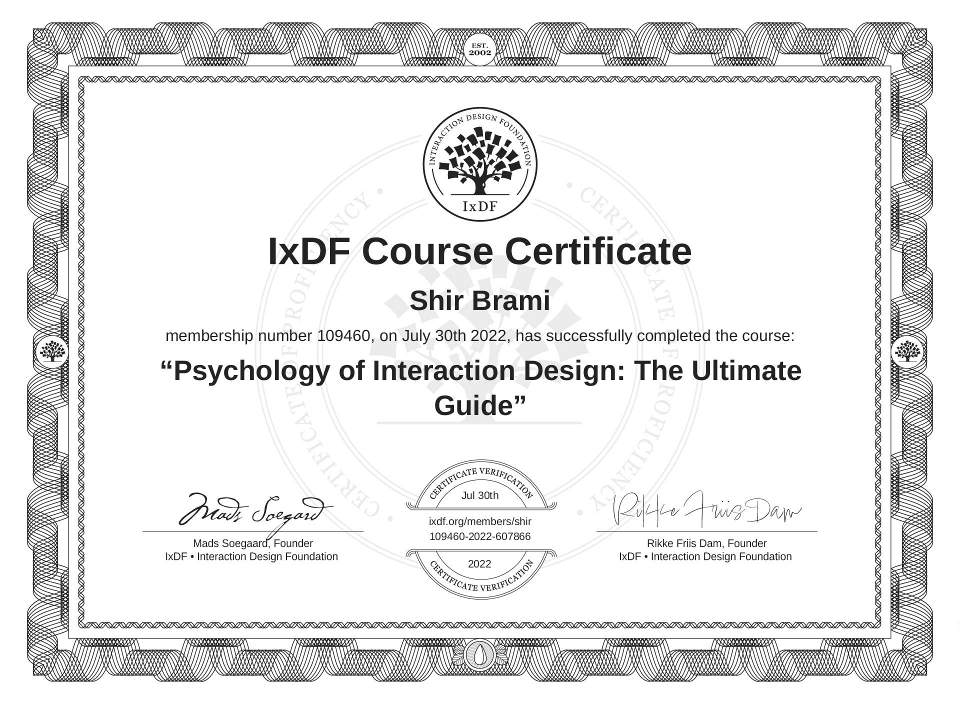 Shir Brami's IxDF Course Certificate: Psychology of Interaction Design: The Ultimate Guide