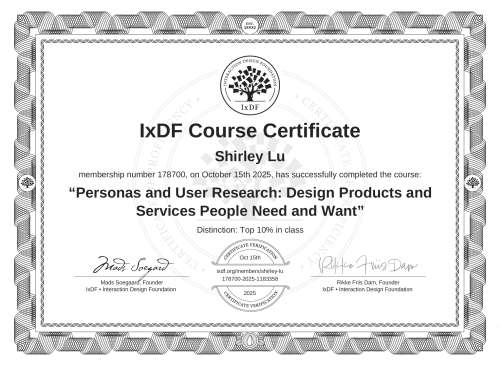 IxDF Course Certificates are awarded to Shirley Lu in formal recognition of their coursework surpassing the rigorous benchmarks of exceptional performance established by the IxDF Educational Codex.