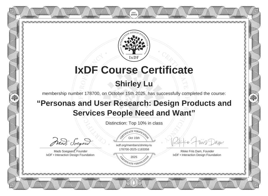 Shirley Lu's IxDF Course Certificate: Personas and User Research: Design Products and Services People Need and Want
