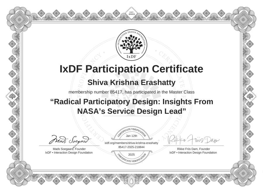 Shiva Krishna Erashatty's IxDF Masterclass Certificate: Radical Participatory Design: Insights From NASA’s Service Design Lead