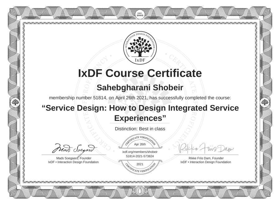 Sahebgharani Shobeir's IxDF Course Certificate: Service Design: How to Design Integrated Service Experiences