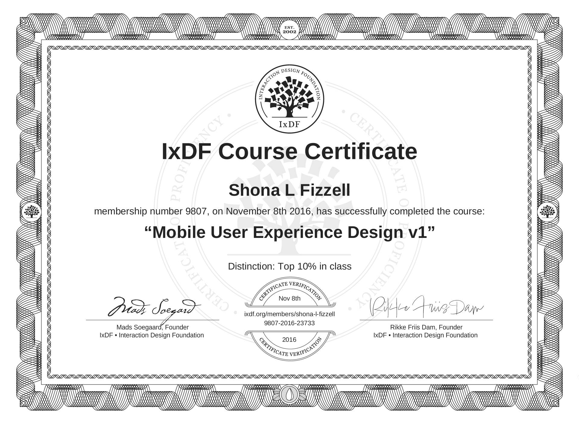 The IxDF Course Certificate above is awarded to Shona L Fizzell with a Top 10% Distinction in formal recognition of their coursework surpassing the rigorous benchmarks of exceptional performance established by the IxDF Educational Codex.