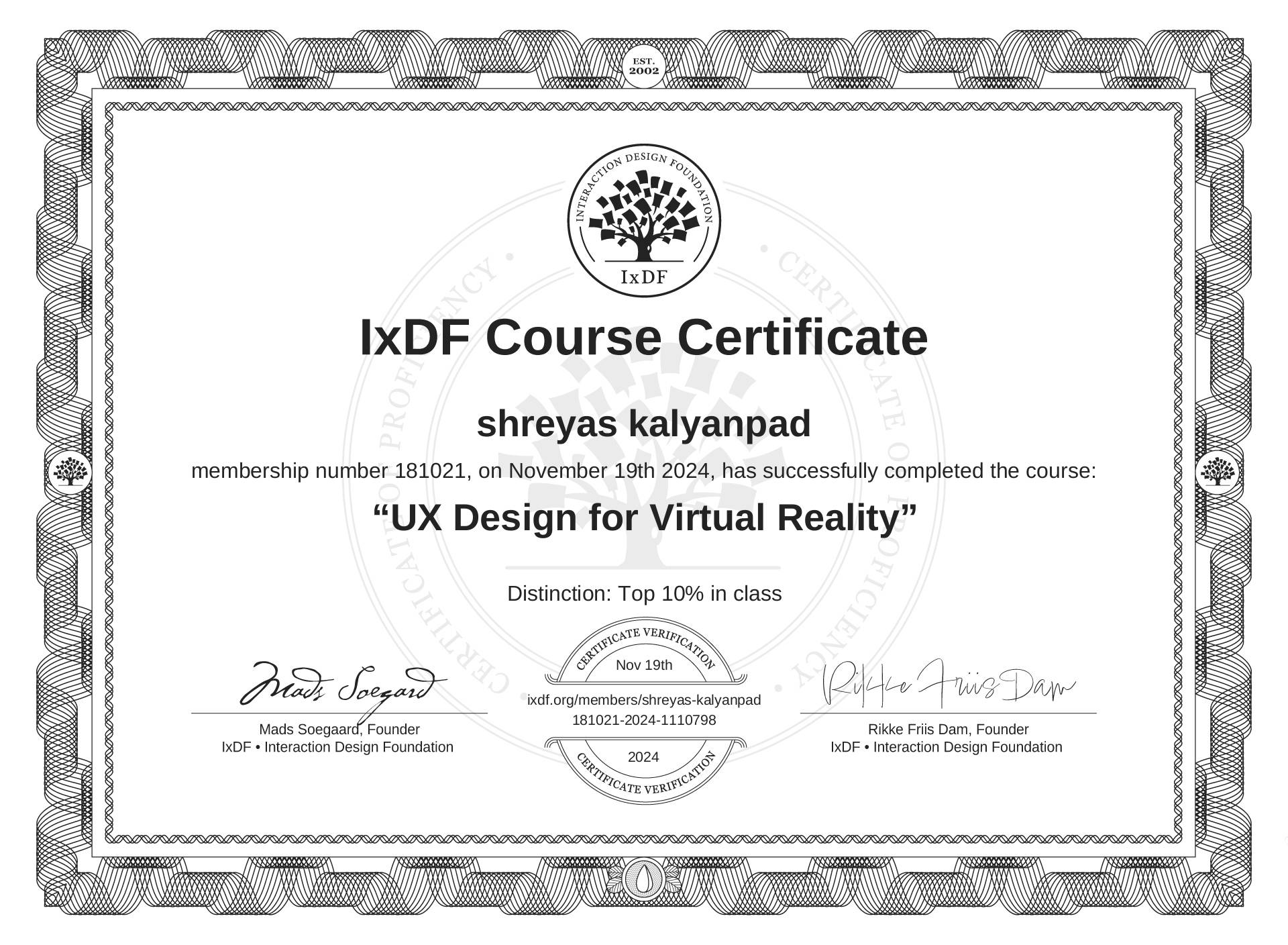 The IxDF Course Certificate above is awarded to shreyas kalyanpad with a Top 10% Distinction in formal recognition of their coursework surpassing the rigorous benchmarks of exceptional performance established by the IxDF Educational Codex.