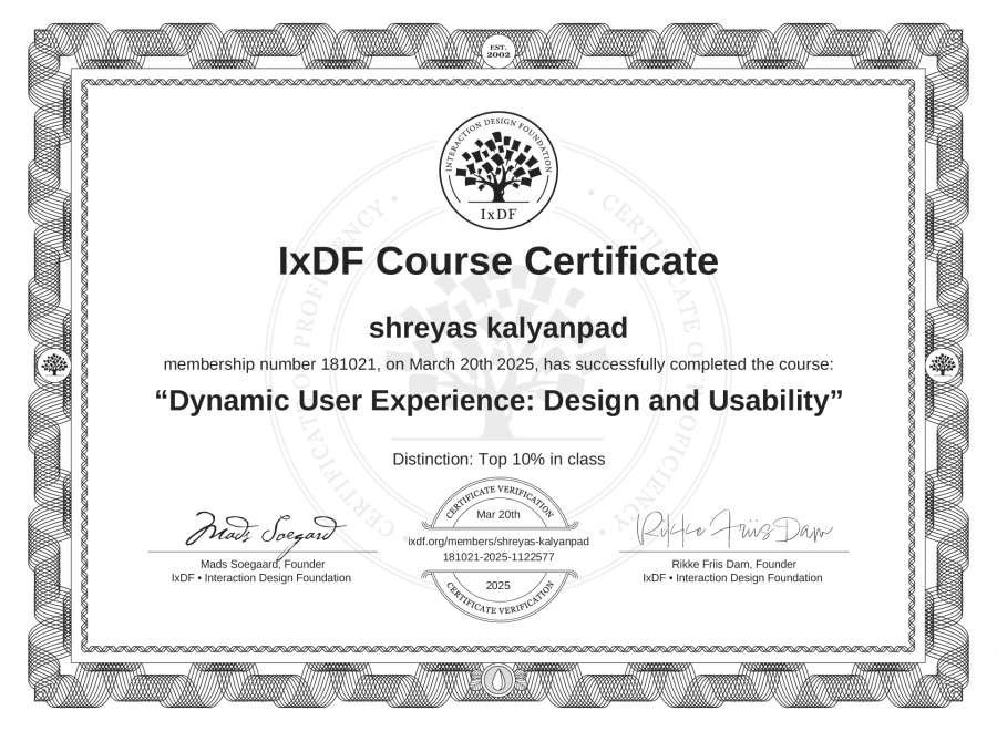shreyas kalyanpad's IxDF Course Certificate: Dynamic User Experience: Design and Usability